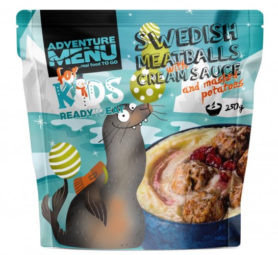 Bramborová kaše (38 %) (brambory, mléko), krémová omáčka (34 %) (smetana, hovězí vývar, zeleninový vývar, máslo (mléko), mouka kukuřičná, mouka rýžová, dijonská hořčice (voda, hořčičné semeno, lihový ocet, sůl), sojová omáčka (pitná voda, sojové boby (24 %) (sója), cukr, sůl, pšeničná mouka), masové kuličky (24 %) (hovězí maso mleté, vepřové maso mleté, cibule, vejce, petrželová nať, kopr, pažitka, libeček, sůl, nové koření, pepř, kardamom), brusinky (4 %).