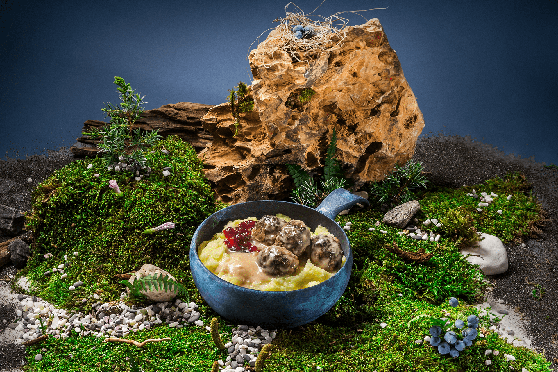 Bramborová kaše (38 %) (brambory, mléko), krémová omáčka (34 %) (smetana, hovězí vývar, zeleninový vývar, máslo (mléko), mouka kukuřičná, mouka rýžová, dijonská hořčice (voda, hořčičné semeno, lihový ocet, sůl), sojová omáčka (pitná voda, sojové boby (24 %) (sója), cukr, sůl, pšeničná mouka), masové kuličky (24 %) (hovězí maso mleté, vepřové maso mleté, cibule, vejce, petrželová nať, kopr, pažitka, libeček, sůl, nové koření, pepř, kardamom), brusinky (4 %).